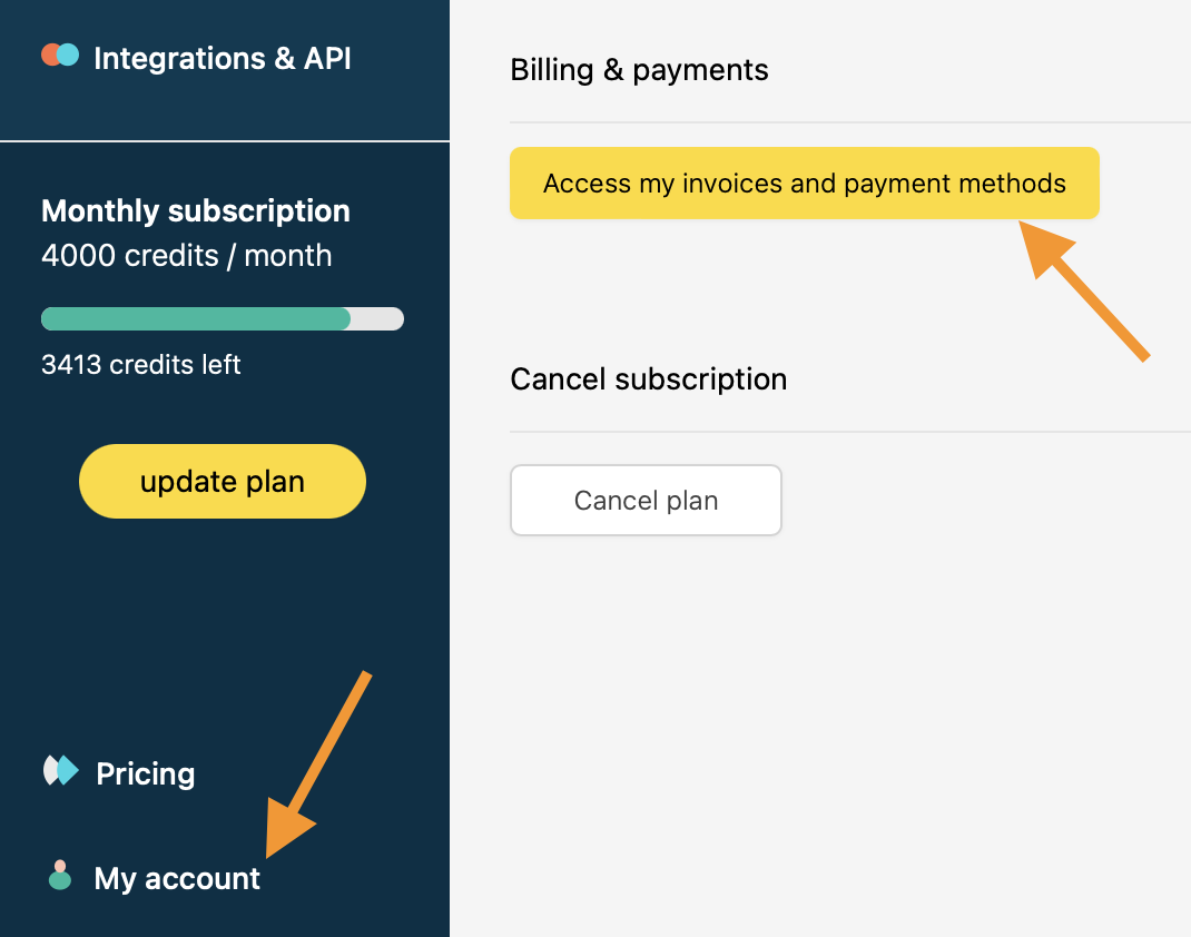 Go to My account in your dashboard, then click on the yellow button "Access my invoices and payment methods".