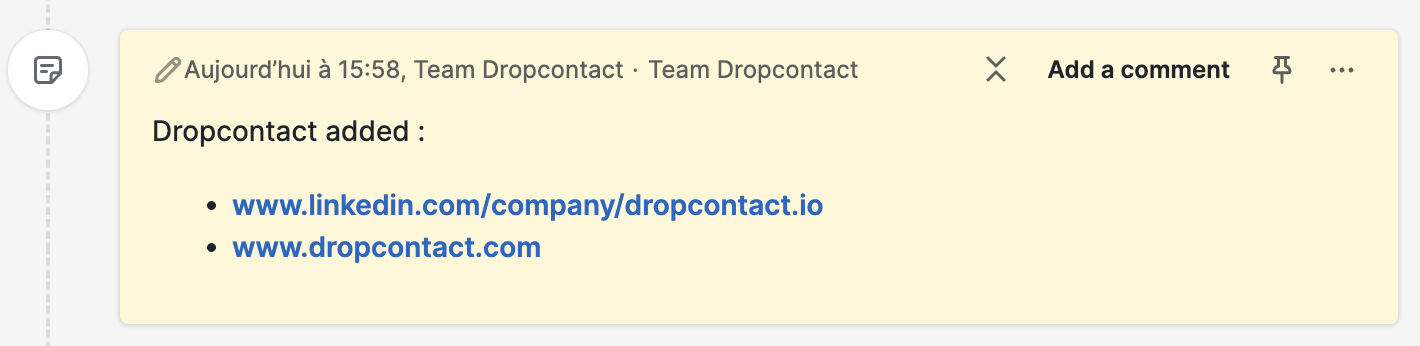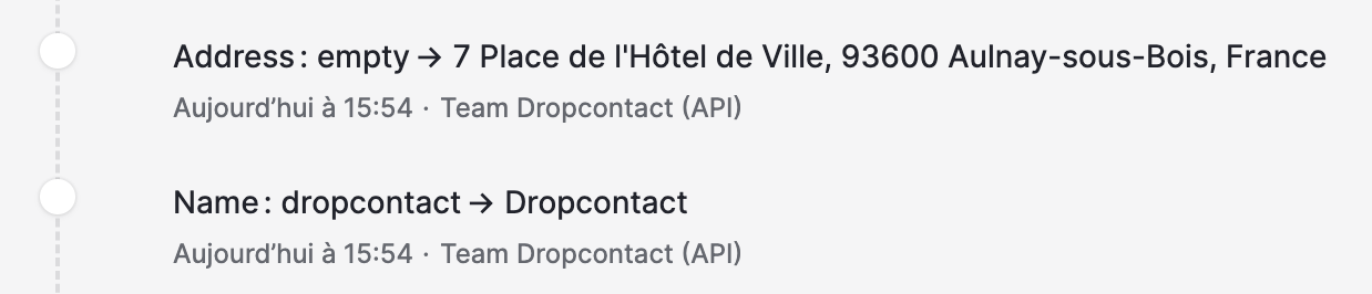 Dropcontact displays in the Pipedrive Notes (yellow) the following changes on the Organizations records: