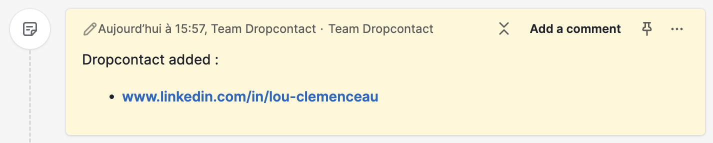 Dropcontact displays in the Pipedrive Notes (yellow) the following changes on the People records: