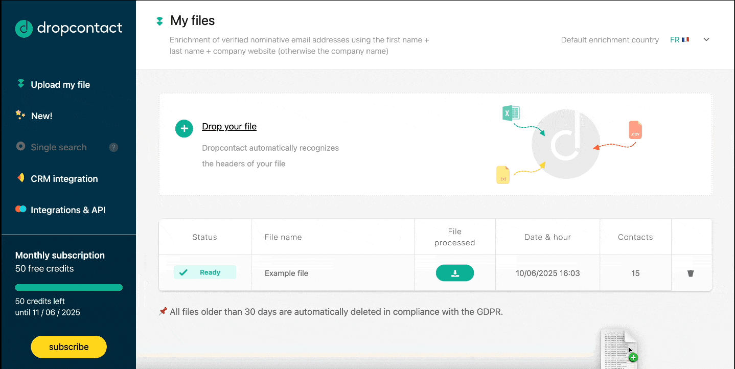 Simply drag and drop your CSV or XLS (Excel) file into the Dropcontact app — it’s that easy!