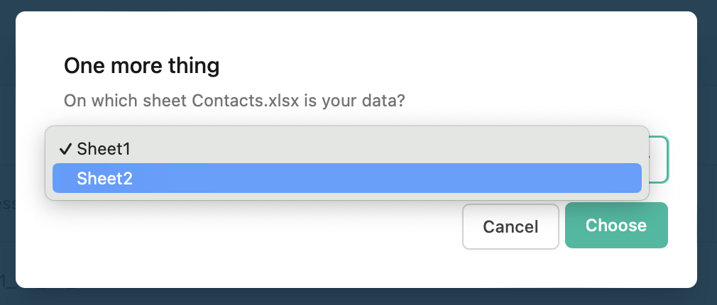 A dropdown menu displays all available sheets in your file. Simply click on the one containing your contact data, then hit "Choose" to proceed.